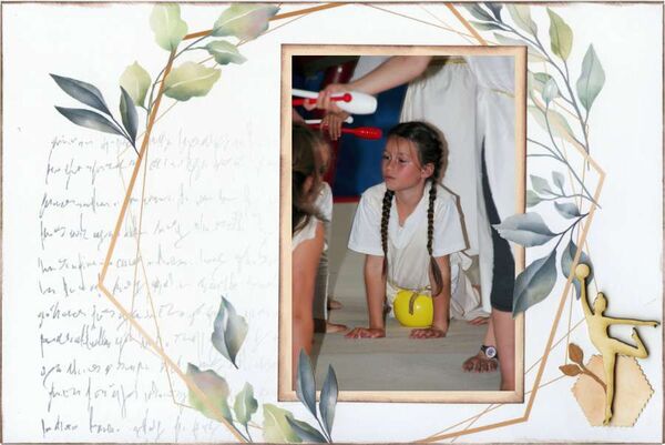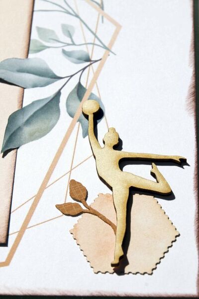 Suite d'un début d'album 20 par 30 cm, sur les années de Gymnastique rythmique de ma fille. Papier de fond "Cadre hexagone et bouquets de feuillage", sur lequel je découpe quelques feuilles pour les faire passer devant la photo .