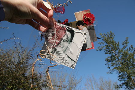 Pour finir ce mini album, j'ai accroché à l'anneau quelques rubans et de la cordeline "tire-bouchonnée", avec même un petit coeur en carton bois suspendu à une extrémité !