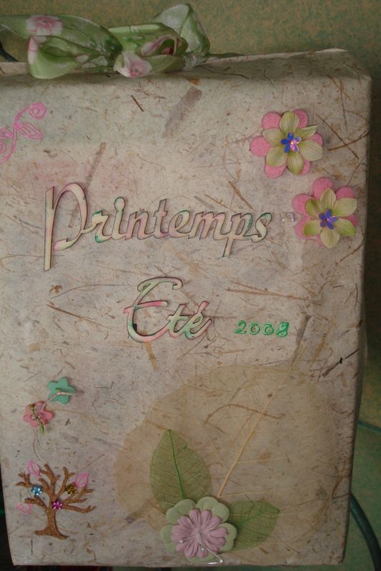 Boîte de céréales recouverte de papier non tissé, mots "printemps, été" en carton bois(embelliscrap) que j'ai encré. Fleurs en feutrine, tissu, arbre perforé ds du liège, boutons,fleurs en strass, 2008 écrit avec du cern,squelettes de feuilles, ruban pr fermer la boîte.