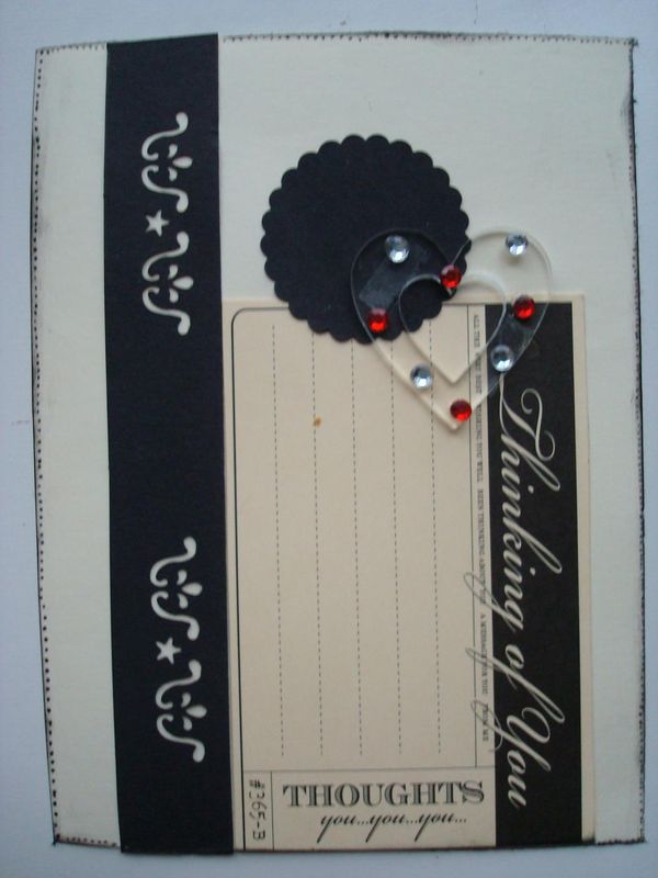 Carte avec 1étiquette toute faîte"thinking of you" du papier perforé et 1joli coeur transparent recouvert de strass.