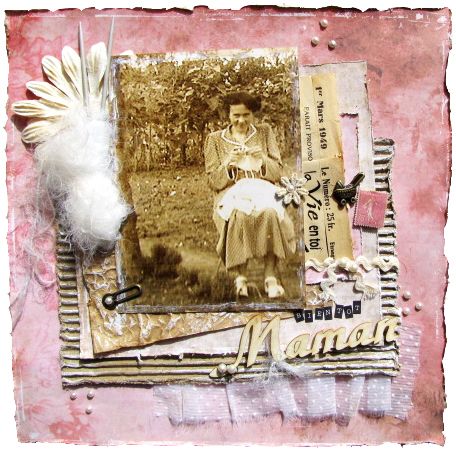 J'ai utilisé pour le fond : des papiers de la collection Boudoir de chez Toga travaillés avec la edge Distresser, un peu d'un journal de broderie de mars 1949 (et un petit journaling en transfert rajouté), d'une date très proche de laquelle la photo a dû être prise, du papier froissé de récup de mon très très gros paquet de farine de cinq kilos !!, MDR !!!, du carton ondulé, du tissu très mode à cette époque qui est collé en rappel des plis de la robe, un vrai timbre ancien, embelissement et flipette cuivrées, titre avec des lettres M.M, et "Maman" de chez Embelliscrap, croquet et laine de mercerie, perles adhésives et aiguilles à tricoter données, merci Line !!