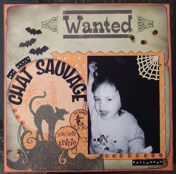 Une petite page sur le thème d'Halloween réalisée avec le kit halloween en carton-bois. La toile d'araignée a été collée telle quelle sur la photo. Les chauve-souris se devaient elles d'être recouvertes de peinture acrylique noire !