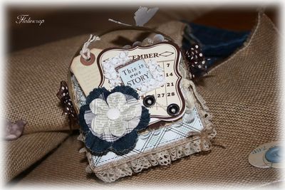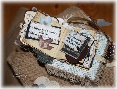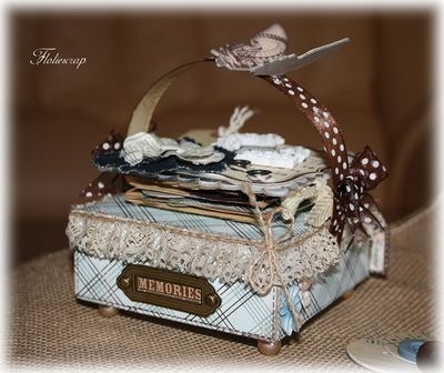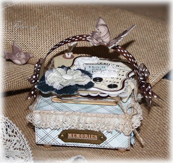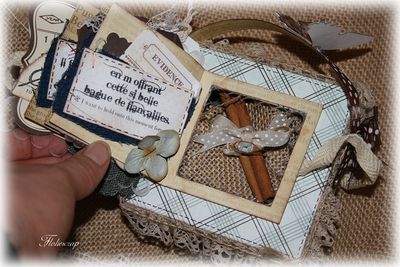 Petit panier renfermant ma bague de fiançailles sur laquelle repose un mini mini avec mes souvenirs. Le support du mini est un cadre transparent EmbelliScrap, tuto disponible (plus de précisions sur mon blog).