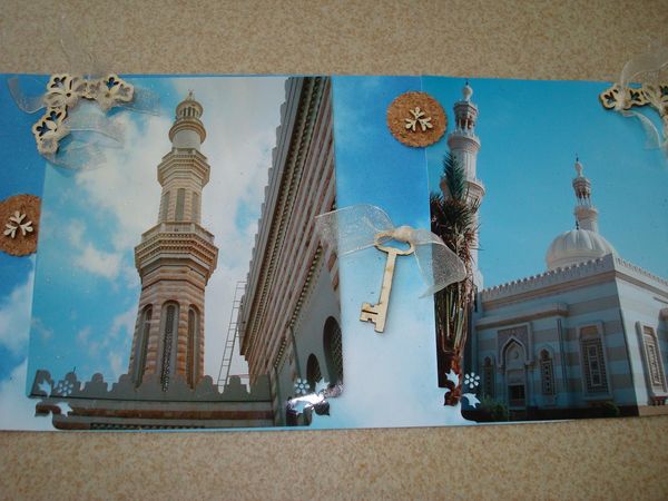1page d'1 mini album sur Dubaï, j'ai utilisé les nouveautés exquises d'embelliscrap, sur les cercles festonnés en liège, j'ai collé l'interieur des coins en carton bois;rien ne se jette chez vs!!!