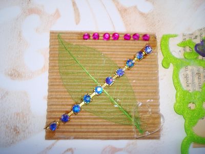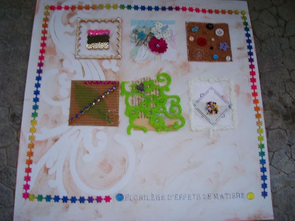 Tout plein de petites merveilles à utiliser pour le scrap et des matières très différentes et toutes aussi riches les unes que les autres: carton bois, perles, micro billes, feutrine,papier, aiguille, boutons, encre (le fond est fait avec de la distress et 1masque), plastique...