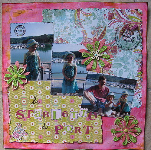 | pour cette page, j'ai choisi de superposer dies en tissu, fleurs en dentelle de fil et fleurs Embelliscrap. Je trouve que le carton bois se mêle très bien aux couleurs acidulées de ces papiers Basic Grey.