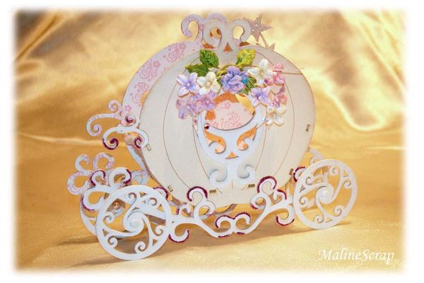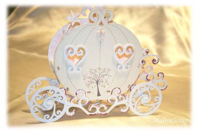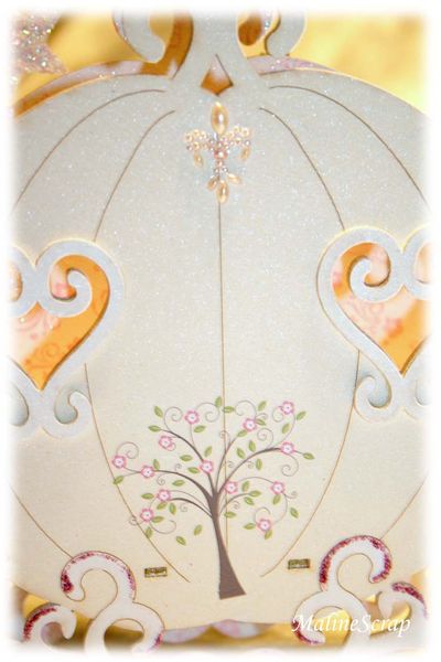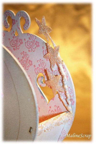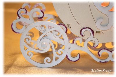 Quand j'ai vu ce magnifique carrosse, j'ai complétement craqué. Il est simplement SUBLIME. J'étais partie pour le peindre totalement en blanc mais les "desseins" ne ressortaient plus. Du coup seul l'intérieur et les arabesques ont été peints. Ce n'était pas de la tarte mais au vu du résultat, ça valait le coup. Tout a été vaporisé de perfect pearl, malheureusement ça ne se voit pas sur les photos.