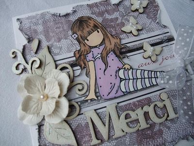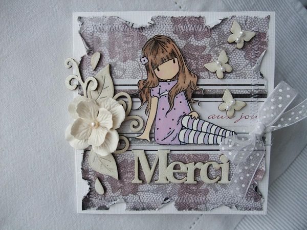 Voici une petite carte mauve avec un tampon ‘’Sugar Nellie’’ et des embellissements que j’ai peints en blanc et embossés avec de la poudre transparente à paillettes. Le personnage a été découpé et monté sur de la mousse 3D pour atteindre le même niveau que les embellissements. Pour cette carte j’ai utilisé du papier ‘’Bazzill’’ blanc et du papier ‘’DDDsigns7’’
