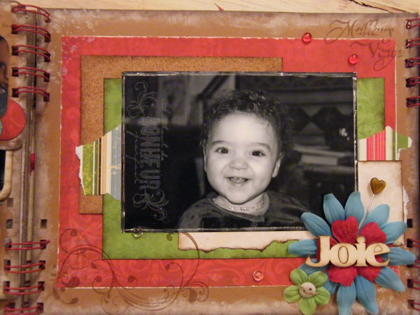 | Une des pages d'un album du premier Noël d'une petite puce bien souriante, respirant la JOIE.