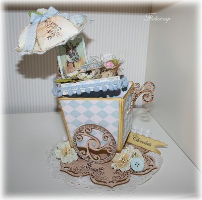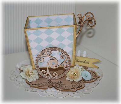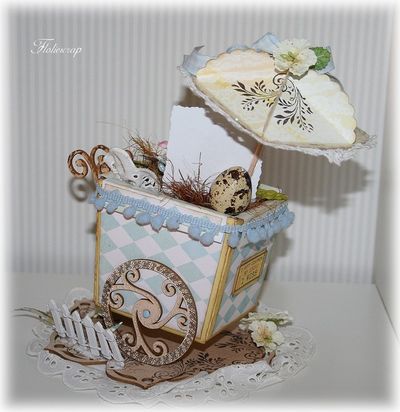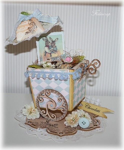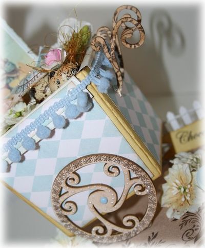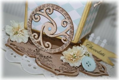 Petite boîte à chocolats réalisée grâce aux belles roues EmbelliScrap (vendues en lot de 2 pour l'occasion), sans oublier une page d'album en carton bois et deux volutes décorées de tampons et de glimmer mist.
