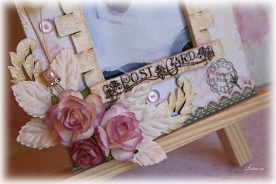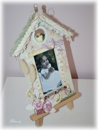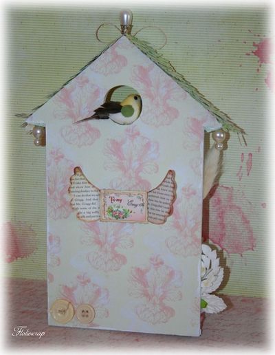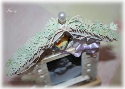 Façade maison Embelliscrap recouverte de peinture blanche et de papiers Crafty Secrets. Le carton bois est aussi recouvert de Crackle Accent puis encré sur les bords avec de la Versafine Sépia. Feuilles damassées travaillées de la même façon.J'ai redessiné les traits de la façade crées par NathaliES cachés par le papier avec des coutures, j'ai aussi crée une "avancée de toit" en papier pour plus de relief.