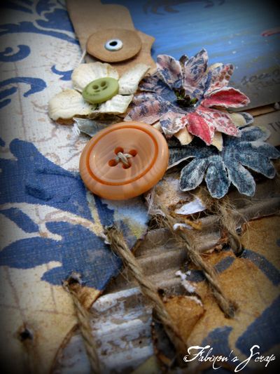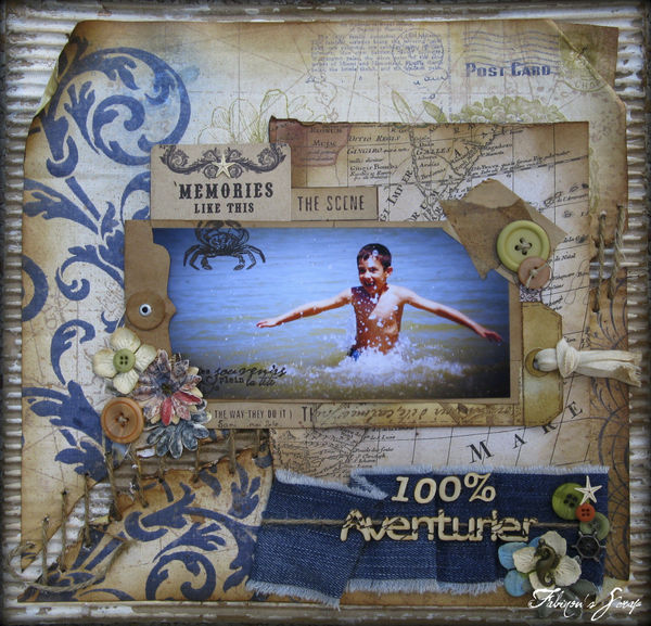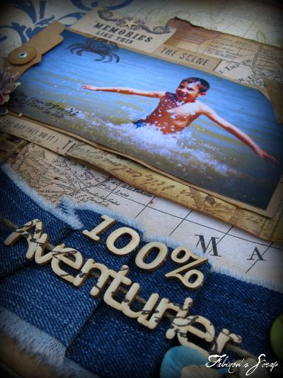 une page réalisée à partir d'un morceau de carton ondulé, sur lequel j'ai collé et "cousu" mon papier. Le mot Aventurier a été tamponné et collé sur un morceau de denim parcouru par un morceau de ficelle.