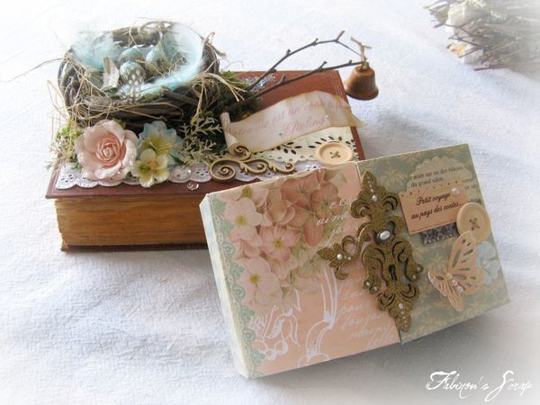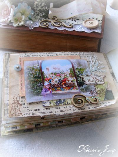 Un petit album, "fait maison", dont les pages sont reliées par quelques points de couture. J'ai utilisé la serrure avec son petit loquet, que j'ai d'abord embossé avec de la poudre "or ancien", pour créer une fermeture aimantée. Pour cela, j'ai placé un petit aimant à l'intérieur de ma couverture, et l'autre sous le petit loquet. Il suffit ainsi d'exercer une petite pression sur la partie gauche de la couverture, pour que l'album s'ouvre en deux.