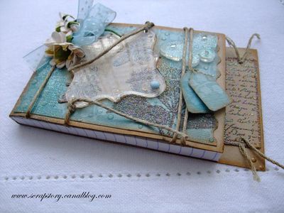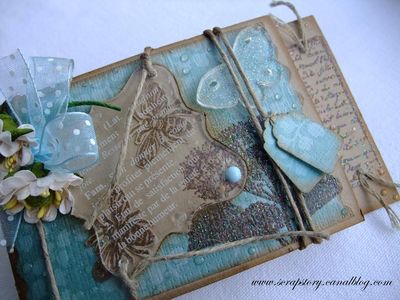 Le matériel: Bazzill ’’Kraft’’, papier imprimé bleu, papier à bloc-notes, la définition de Joie et le papillon Embelliscrap, tampons Artemio, ficelle de lin, fil DMC,1 brad, ruban à pois, encre Versafine vintage sépia, encre Colorbox ’’Copper’’, poudre transparente à paillettes, glossy accents, fleurs récup.