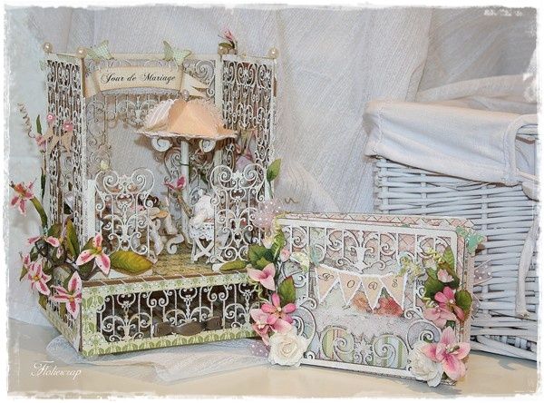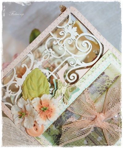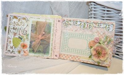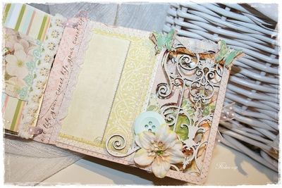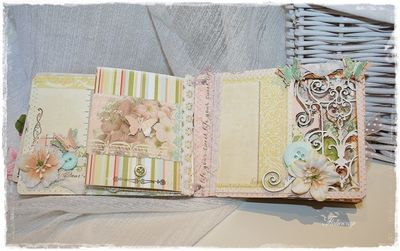 Mini album Pergola embossé en blanc avec quelques touches de crakle accent blanc. J'ai joué avec les volutes du mini en les mettant en valeur soit en les superposant (page après page), soit en mettant du tulle en dessous, ou alors en collant du papier pour les faire ressortir.
