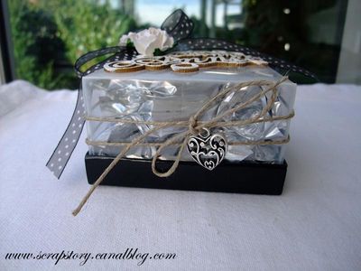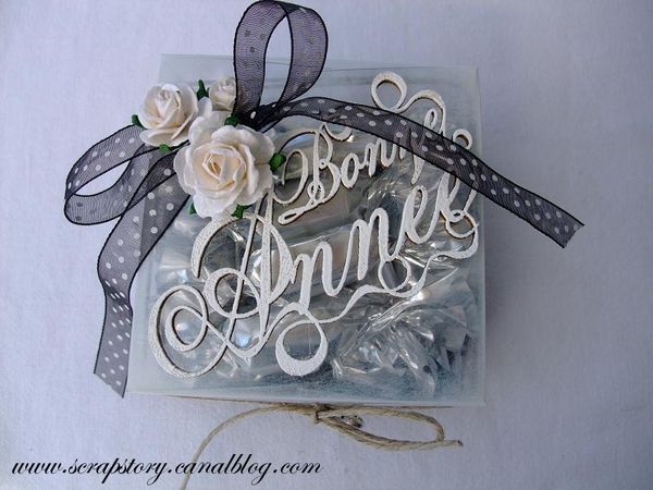 Le matériel : boîte transparente, mots en carton-bois ‘’Bonne Année’’, roses shabby blanches, ruban à pois, ficelle de lin, cœur en métal. Les mots ont été embossés à chaud avec de la poudre blanche et la boîte a été encrée avec du Stazon.