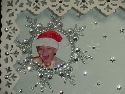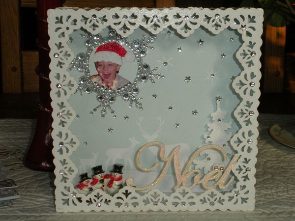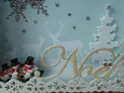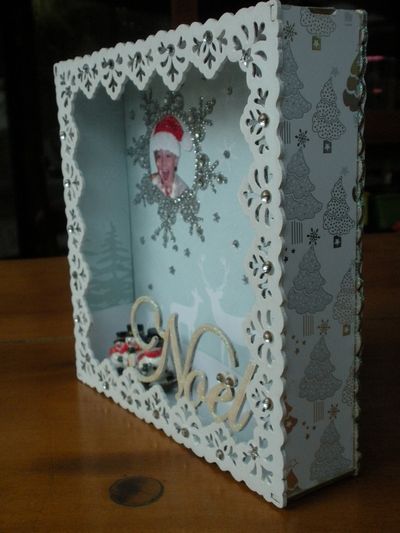 L'intérieur, comme l'extérieur sont habillés de papier. Les bordures sont peintes en blanc, avec ajout de petits strass.Le mot Noël est enduit de glitter pailleté.