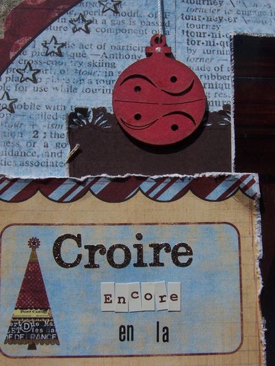 | Ici, j'ai utilisé une boule de Noël en bois (peinte en rouge) ainsi qu'une étoile (pailletée) de la même planche. |