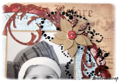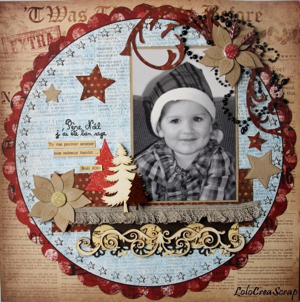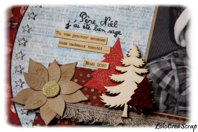 | Une page de noël avec encore ma petite puce en lutin, et un beau petit sapin et une belle volute en carton bois |