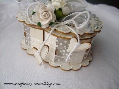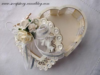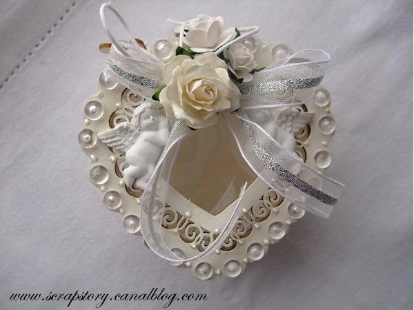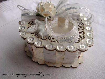 Quand j’ai vu cette jolie boîte en carton-bois, je me suis tout de suite dit qu’elle méritait bien sa place sur la table de jeunes mariés, ou d’un baptême. Après l’avoir peinte en blanc, je l’ai décorée avec des anges en résine imitation plâtre, des perles de pluie transparentes et de la peinture 3D. Il ne me reste plus qu’à la remplir de dragées :-)