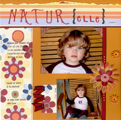 Papiers bazill et 3 bugs in the rugs. La "couture" est faire à l'aide de rub on. Le titre est découpé à la QK : police Eliza et sunshine. Les petits cubes sur le ruban et à côté du titre sont des morceaux de micro mosaïque. Le centre de la fleur est un embellissement embelliscrap.