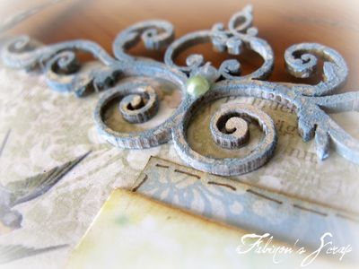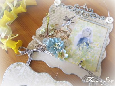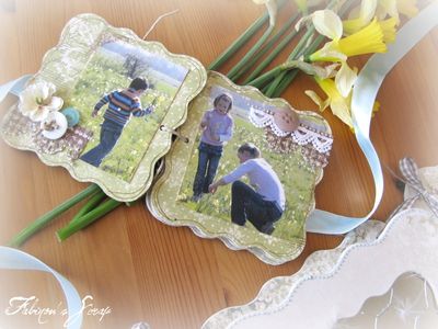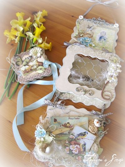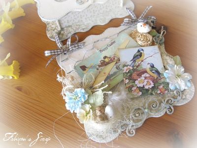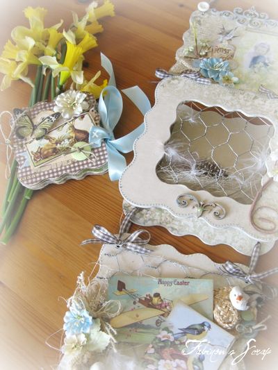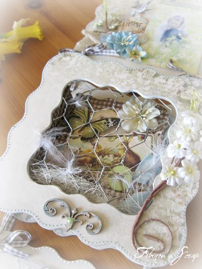 Voici une décoration, idéale pour les fêtes de Pâques, elle est réalisée à partir du "Mini Album Ondulé en Boîte, en Carton" ainsi que de deux pages "Ondulée à Troutrou en Carton". Pour les assembler, il suffit de faire passer un ruban ou une ficelle dans les trous déjà percés. J'ai choisi de recouvrir l'ensemble de papier, ce qui masque les autres trous, mais c'est une question de goût ;-) Le mini-album se glisse dans sa boîte, décorée avec du grillage à poule. Les différentes volutes sont peintes au gesso, puis avec quelques touches légères, colorées avec de la peinture crackle.