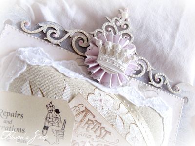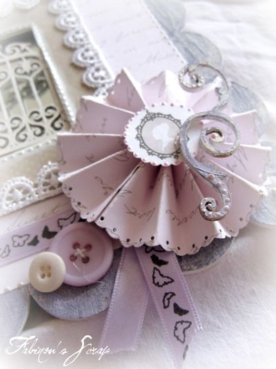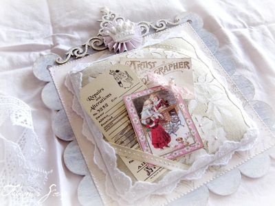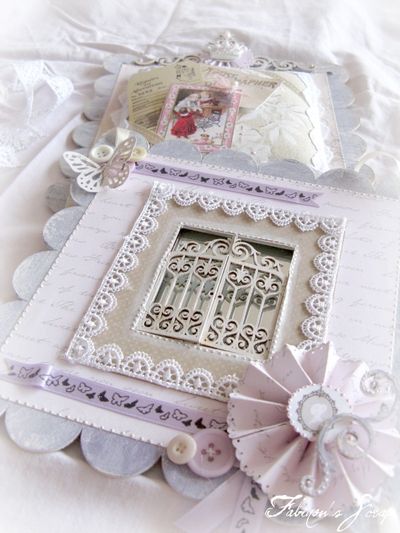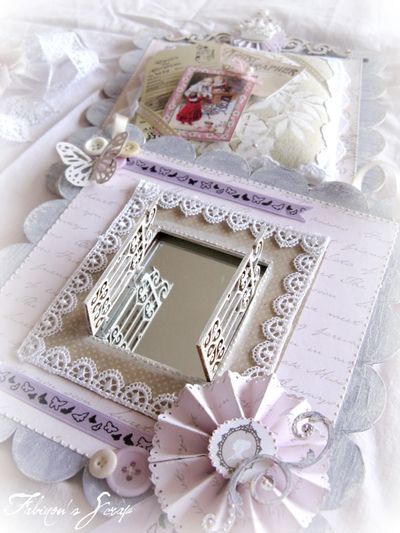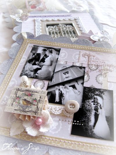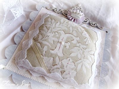Un triptyque dans des teintes romantiques: la plaque avec le portail cache un petit miroir (récupéré sur un miroir de poche offert par un célèbre magasin de beauté vpc), le petit coussin, avec initiale, sert de support à des images, grâce aux petits rubans sur les côtés, et enfin la dernière plaque avec 3 petites photos.