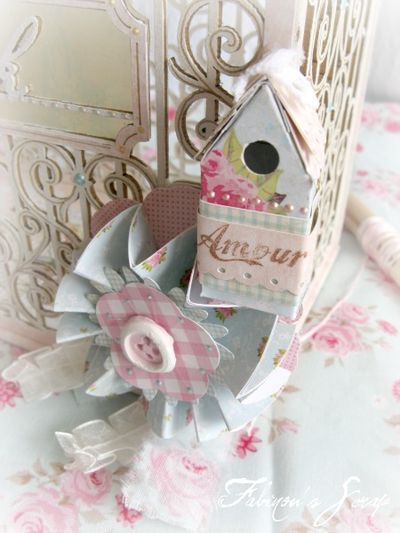 Le petit nichoir, les roses en pâte céramique, la banderole sont fait main.
