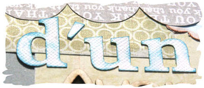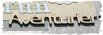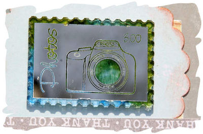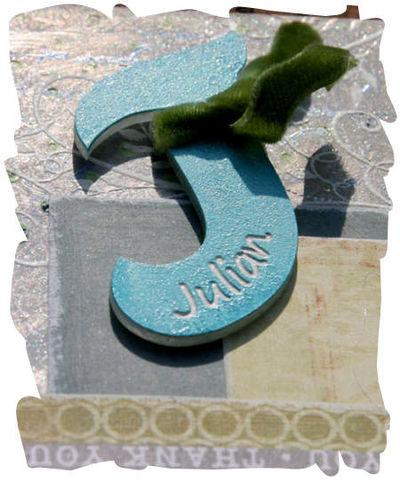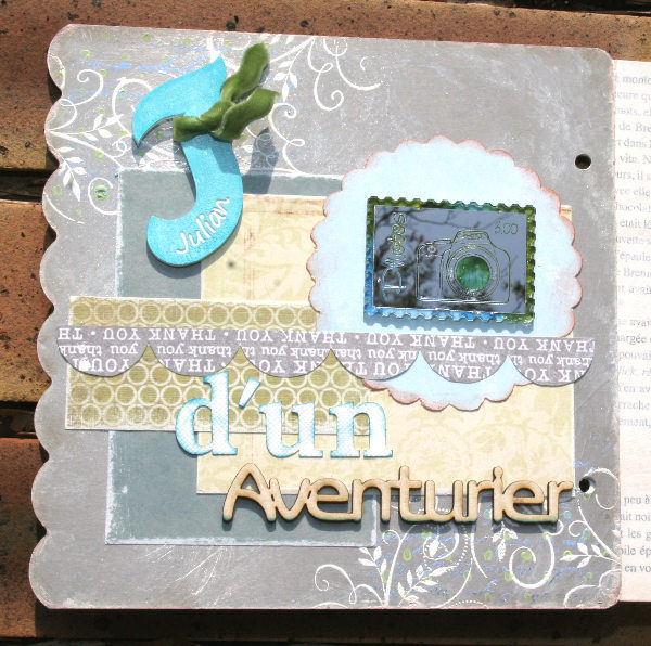 Le dos d'un mini album, avec le timbre Photos, dont les dessins gravés ont été colorés aux encres à alcool. Les lettres "d'un" sont les lettres Elodie en Bazzill blanc, que j'ai encré en bleu. Le POC J gravé Julian est peint en turquoise et a été entouré d'un ruban !!!