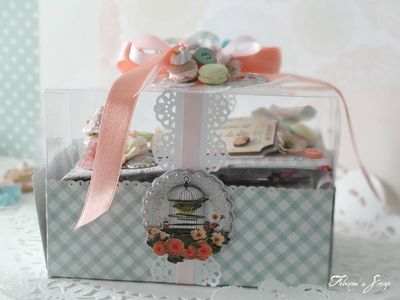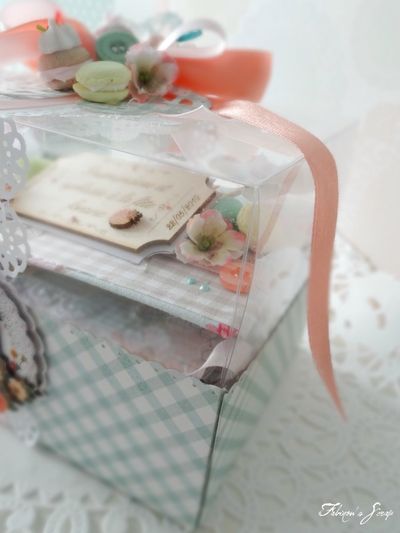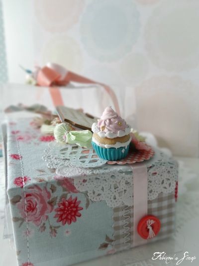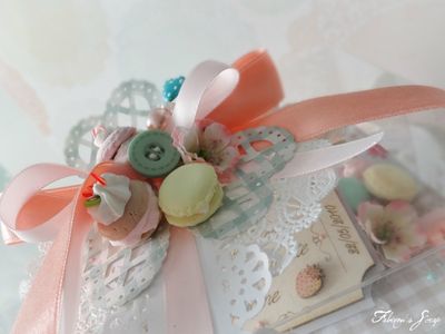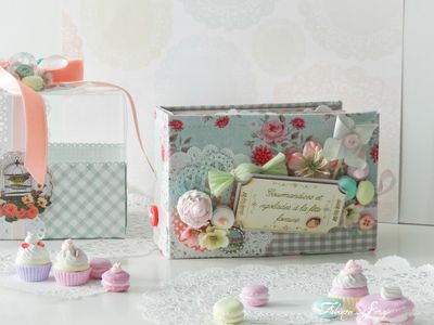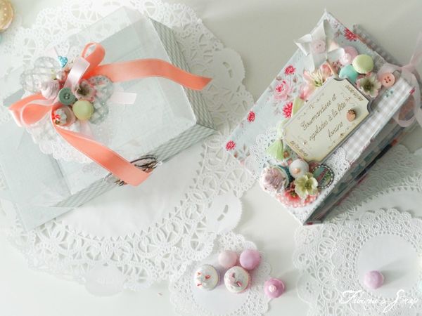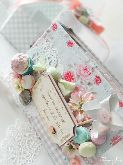 Dans une boîte plastique recyclée, se cache un mini-album recouvert de tissu et essentiellement décoré de créations Fimo "faites maison" ;-)