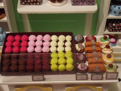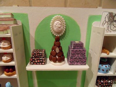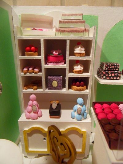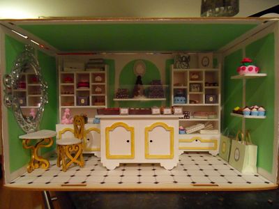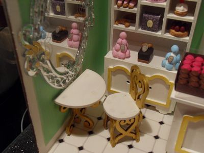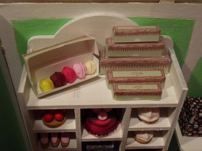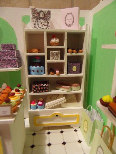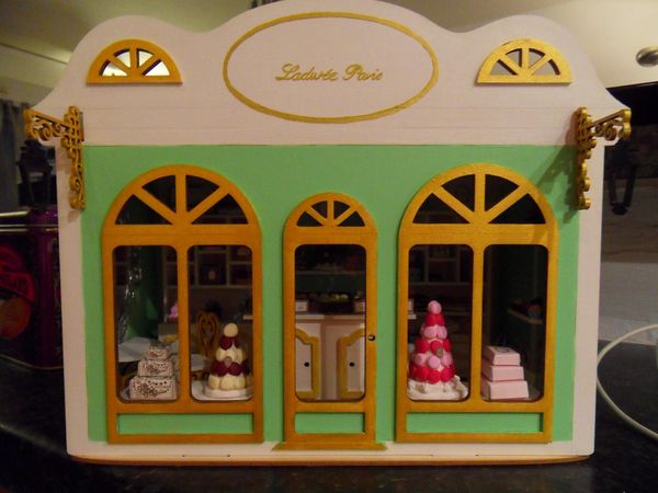 Ca fait longtemps que j'aime Ladurée et j'avais envie de faire une boutique miniature. J'ai trouvé la boutique qu'il me fallait sur EmbelliScrap et j'ai essayé d'en faire quelque chose de sympa. J'ai utilisé de la peinture pour les murs et la façade, un bon logiciel de photo et mon imprimante pour les boîtes miniatures Ladurée, de la FIMO pour les pâtisseries.