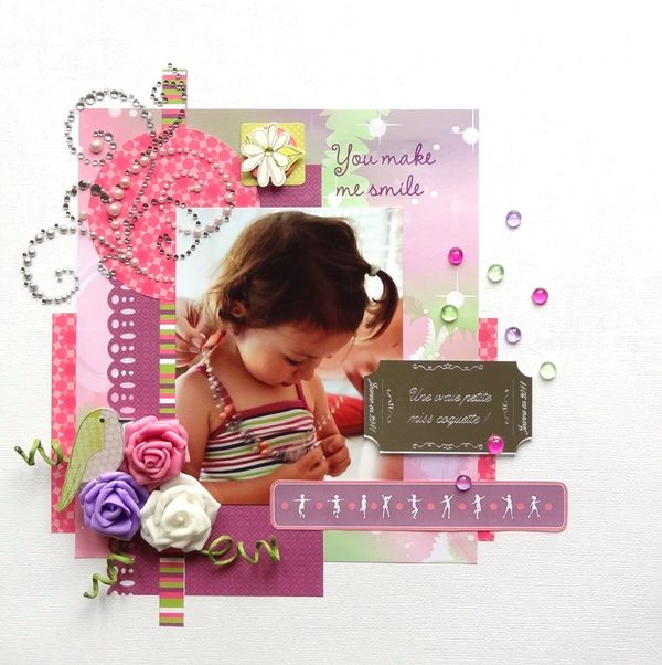 | Une page douce et printanière avec un superbe embellissement en miroir gravé spécialement pour cette photo très fille ! |