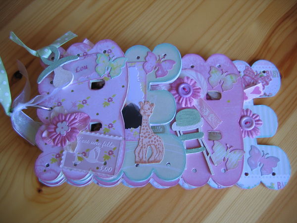 J'ai voulu réalisé un mini album Bébé pour ma petite Lou afin de l'offrir à ses parents pour Noël (oui je sais je suis très en avance mais pour une fois). J'ai donc utilisé le mini album Bébé, les petits objets en cartons et des transparents de Nathalie.
