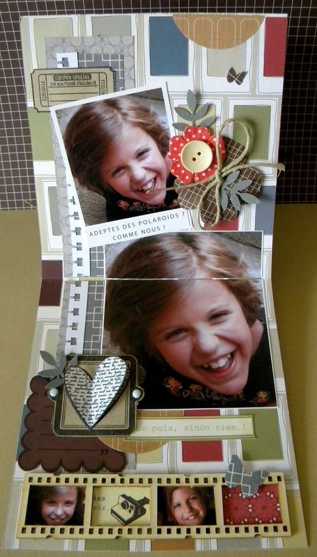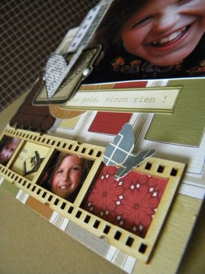 Sur cette double page de mon album, j'ai joué avec la découpe de pellicule en glissant sous les ouvertures, des photos et papiers.