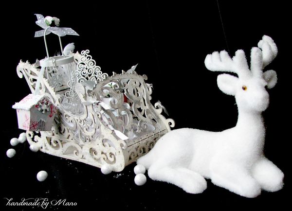 Je connais le traineau de Floliescrap "depuis toujours" LOL pour avoir eu le coup de foudre pour sa magnifique création sur son blog mais il m'a toujours manqué de temps pour le réaliser! J'ai adoré scrapper ce traîneau, je l'ai peint avec de l'acrylique blanche et donné quelques touches d'acrylique argenté. Le fond du traineau est recouvert de lin blanc, j'y ai placé une petite lanterne avec une bougie led ainsi qu'un arbre plutot shabby. Dans un des deux cubes, j'ai placé des fleurs, et pour le second, je l'ai emballé comme un cadeau; enfin j'ai pendu une petite maisonnette à ma lanterne. Merci à Floliescrap et Embelliscrap pour cette magnifique création! bisous