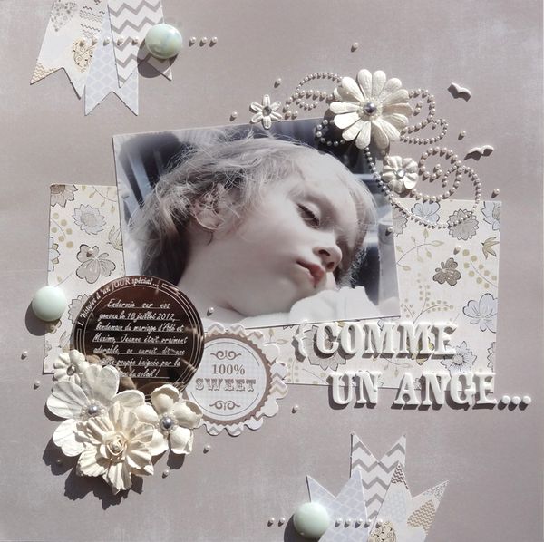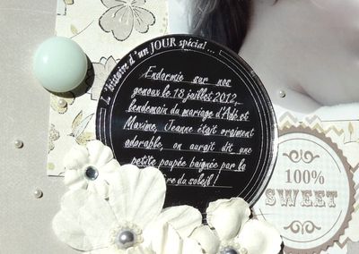 La plaque miroir gravée avec le texte de mon choix s'intégrait parfaitement à ce scrap que j'ai voulu mettre en scène en toute légèreté. J'adore la personnalisation extrême des embellissements proposée par Embelliscrap ! :-)