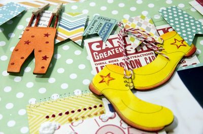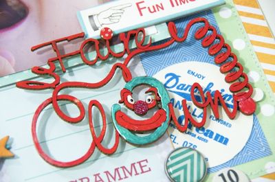Pour créer l'illusion que le déguisement de clown est suspendu, une petite pince en bois, divisée en deux, et collée sur le pantalon, et pour les chaussures, un peu de baker twine, 2 morceaux, de même longueurs, collés sur le haut des chaussures, puis liés ensemble, et ensuite, l'ensemble est simplement passé par dessus la bannière, sans colle, pour que l'effet soit le plus naturel possible.