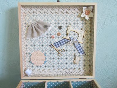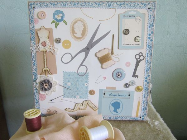 Un cadeau pour une amie qui allie ces deux talents. J'ai utilisé la superbe panoplie de couturière, un peu de tissu et de dentelle, des boutons, des épingles une mini bobine de récup, un tampon de bri, fleurs faites maison, papiers légèrement encrés.