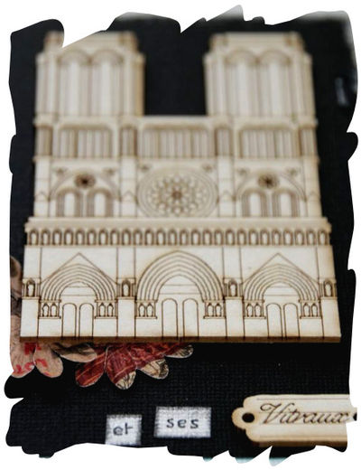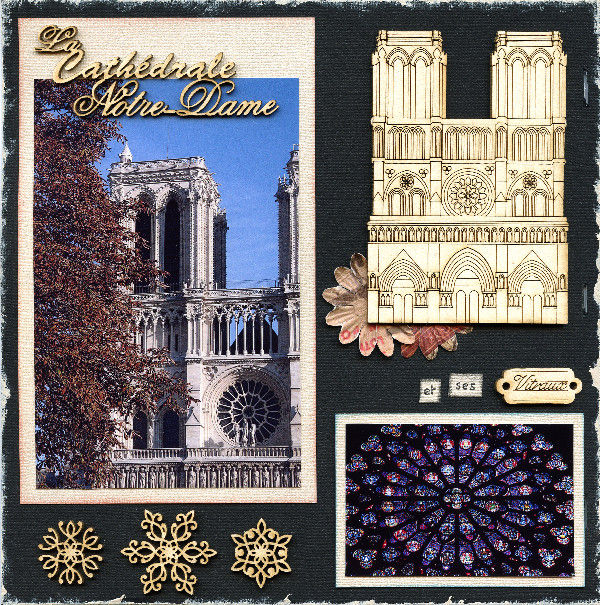 J'avais envie de bien mettre en valeur cette très belle Cathédrale en carton bois (qui m'a pris des heures à dessiner, cela dit en passant !!!), et je l'ai donc collé directement sur la page noire, pour la faire bien ressortir ! Le titre a très facilement trouvé sa place sur la jolie photo et j'ai trouvé que les cristaux de neige qui "trainaient sur ma table de scrap" s'accordaient parfaitement avec la géométrie de ces magnifiques vitraux ! Le tour était joué.