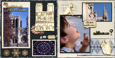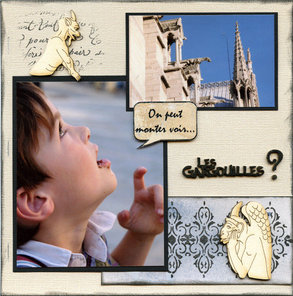 Je vais profiter de ce mini album pour raconter nos visites à Paris ! Les enfants adorent feuilleter les albums photos, comme s'ils étaient en train de lire un livre d'image... mais il s'agit de leur histoire ! J'ai donc profité des bulles de dialogues en POC pour faire parler Julian qui voulait monter en haut de la cathédrale Notre-Dame ! La page est très simple, avec deux photos (encadrées en noir, pour les faire ressortir), mes gargouilles adorées et deux jeux de tampons !