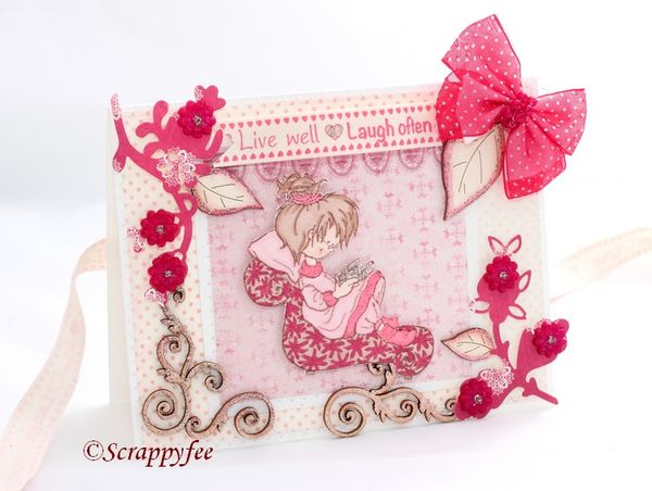 Carte réalisée pour la DT Snoesjes. Les arabesques et feuilles en carton bois sont encrées en rouge foncé, puis pailletée au stickles. |