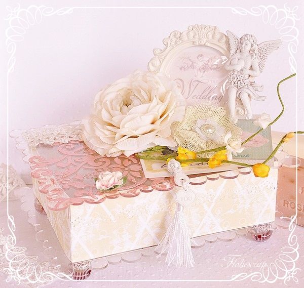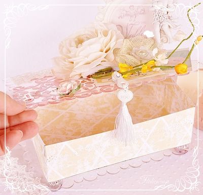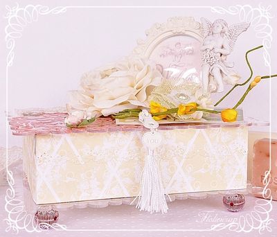 Boite shabby ayant pour support deux plaques rectangulaires transparentes. Ajout de motifs tout en transparence sur la plaque de dessus avec un pochoir EmbelliScrap et de la peinture Viva.