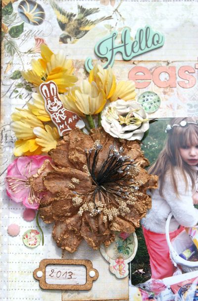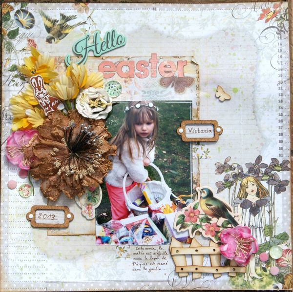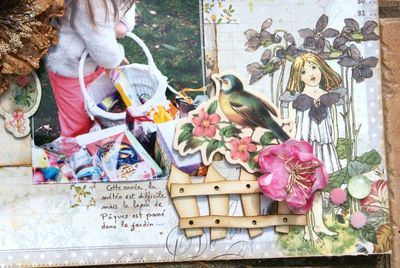 Une page colorée et fleurie pour fêter le printemps. Beaucoup de volume et un mélange de matières. on retrouve le POC petit lapin (un incontournable pour toutes les réas de Pâques!), des étiquettes en liège , une barrière et un petit papillon en carton bois juste ombrés à l'encre distress vintage photo