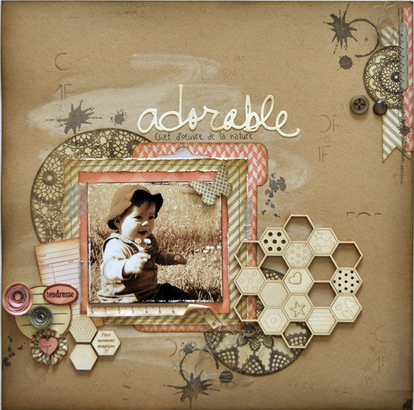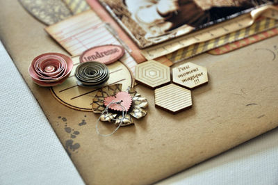 Pour la déco, j'ai choisi les beaux hexagones que j'ai passé à la distress Stain blanche. On peut aussi y voir un bouton "coeur" passé à la Dsitress Stain rose.