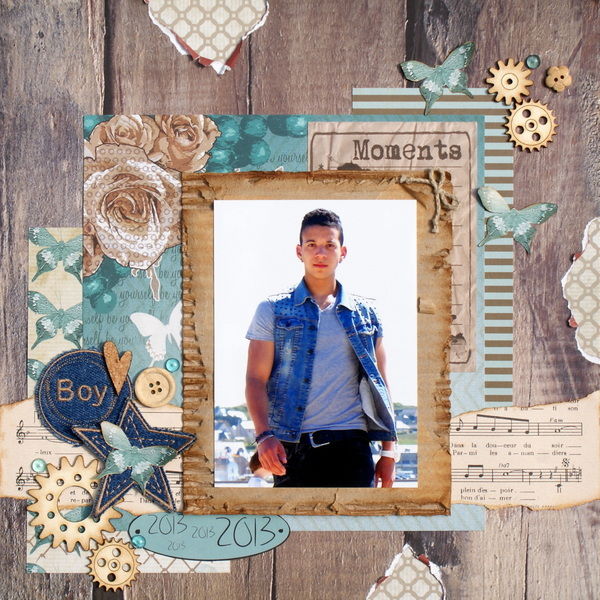 | Papier Rayer et Lorelaï Design, embellissements en Jean La Dame de Kit, embellissements engrenages en bois et coeur en liège. |