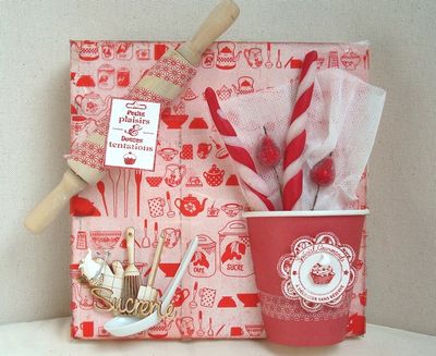 Des toiles rouges, des sucre d'orge en fimo mis dans un gobelet que j'ai coupé en 2, des tampons...