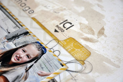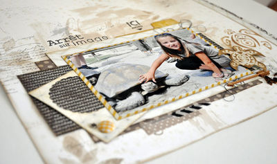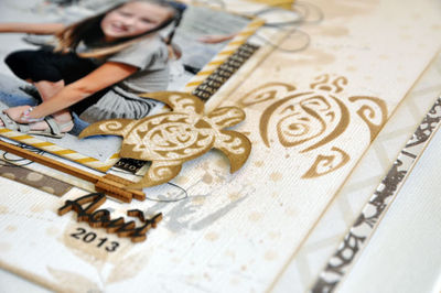 J'ai utilisé le pochoir "Tortues" directement sur mon fond de page avec de la distress et puis sur un papier pour ensuite découper et monter en 3D sur ma page.