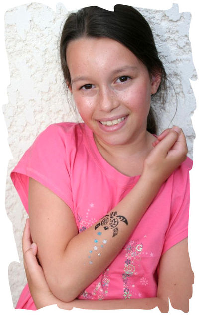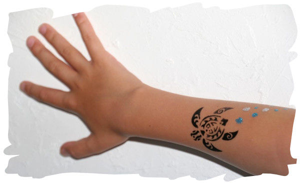 Eva a adoré les tatouages tortues en maquillage pour enfant, et elle a voulu que je lui fasse le même en tatouage temporaire ! J'ai pris l'encreur Kenji tatoo, que j'ai utilisé comme en scrap avec de la mousse Cut N Dry. Ce pochoir est assez rigide et ne s'adapte pas très facilement à la courbure du bras. Du coup, je le garde plat et je l'incline au fur et à mesure en suivant la courbure du bras. Cela marche bien ! J'ai fait les bulles d'eau avec le colle pour la peau Kenji et les paillettes Kenji. Le résultat était "Pimp" !!! Voilà un superbe tatouage temporaire pour une journée de fête ou de vacances. Ce tatouage dure deux ou trois jours puis s'enlève assez facilement avec du produit démaquillant ! J'aime beaucoup. Pour info, le pochoir avec l'encre à tatouage temporaire se nettoie très bien avec le nettoyant à Stazon.