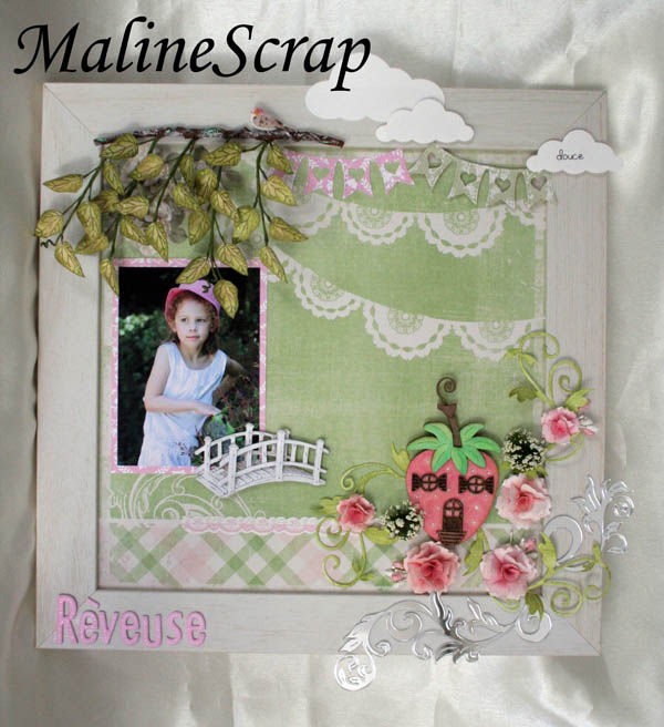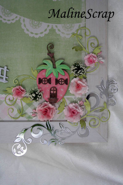 Un cadre avec une photo de ma fille ainée cette fois. La maison fraise est mise en couleur aux crayon aquarelle et encre pailletée. Les grains de la fraise sont mis en relief avec de la peinture 3D. la grande volute en miroir a été cassé au niveau d'une fine jonction afin de s'adapter parfaitement à ma décoration