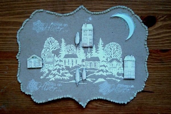 Une carte plus classique avec de l'embossage sur du papier kraft, des maisonnettes en carton bois encrées, pailletées et ornées de perles que j'ai posé une par une à l'aide d'une pince à épiler.